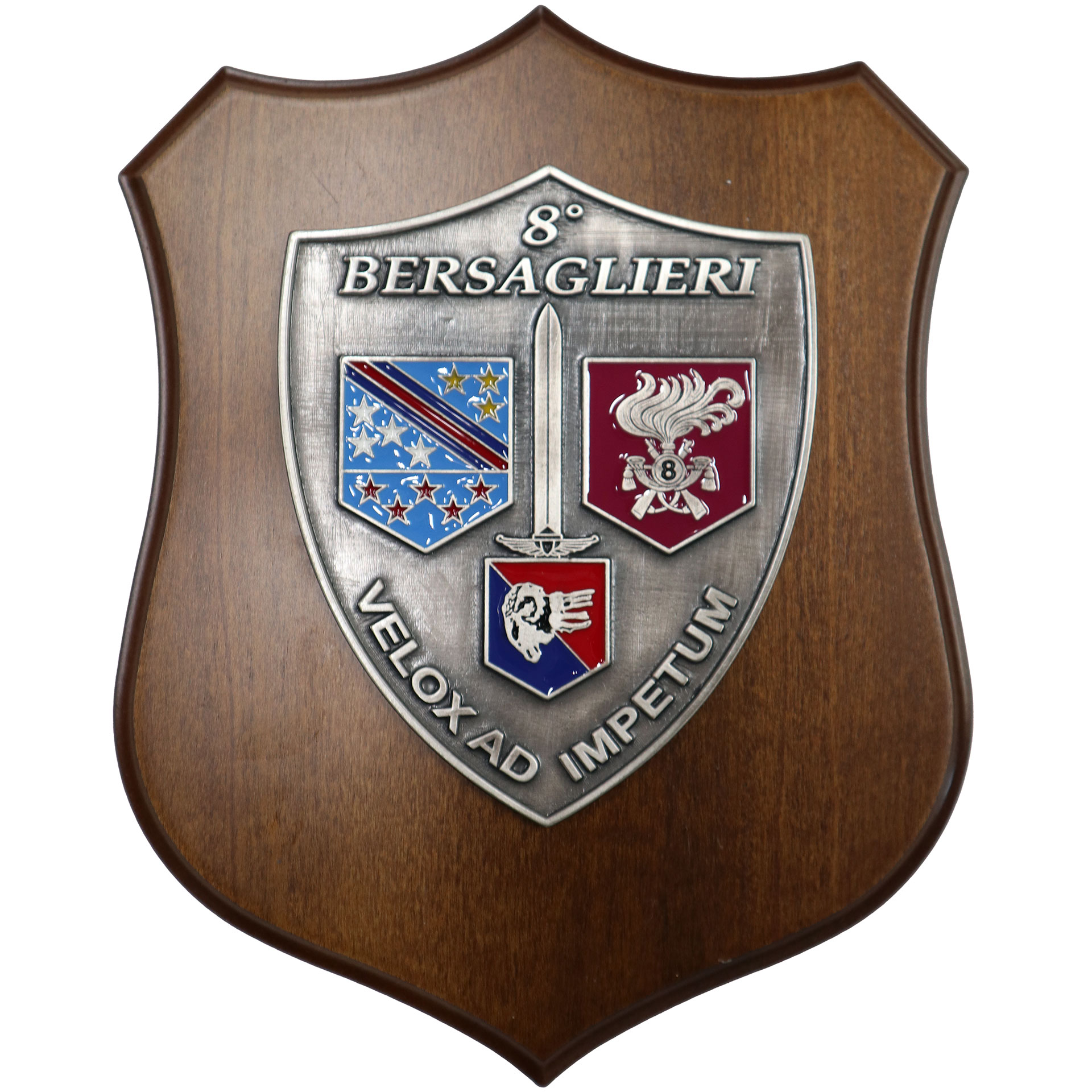 CREST IN METALLO SMALTATO BASE LEGNO 22,5X17,5CM 8 BERSAGLIERI