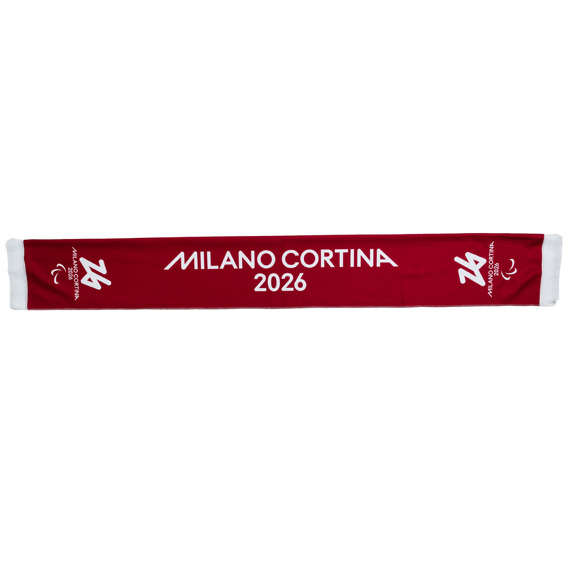 SCIARPA OLIMPIADI MILANO CORTINA 2026 IN POLIPILE STAMPATA DIM. 130X17CM FONDO MAGENTA CON SCRITTA MILANO CORTINA 2026 E LOGO PARALYMPIC EMBLEMA MONOCROMATICI BIANCHI