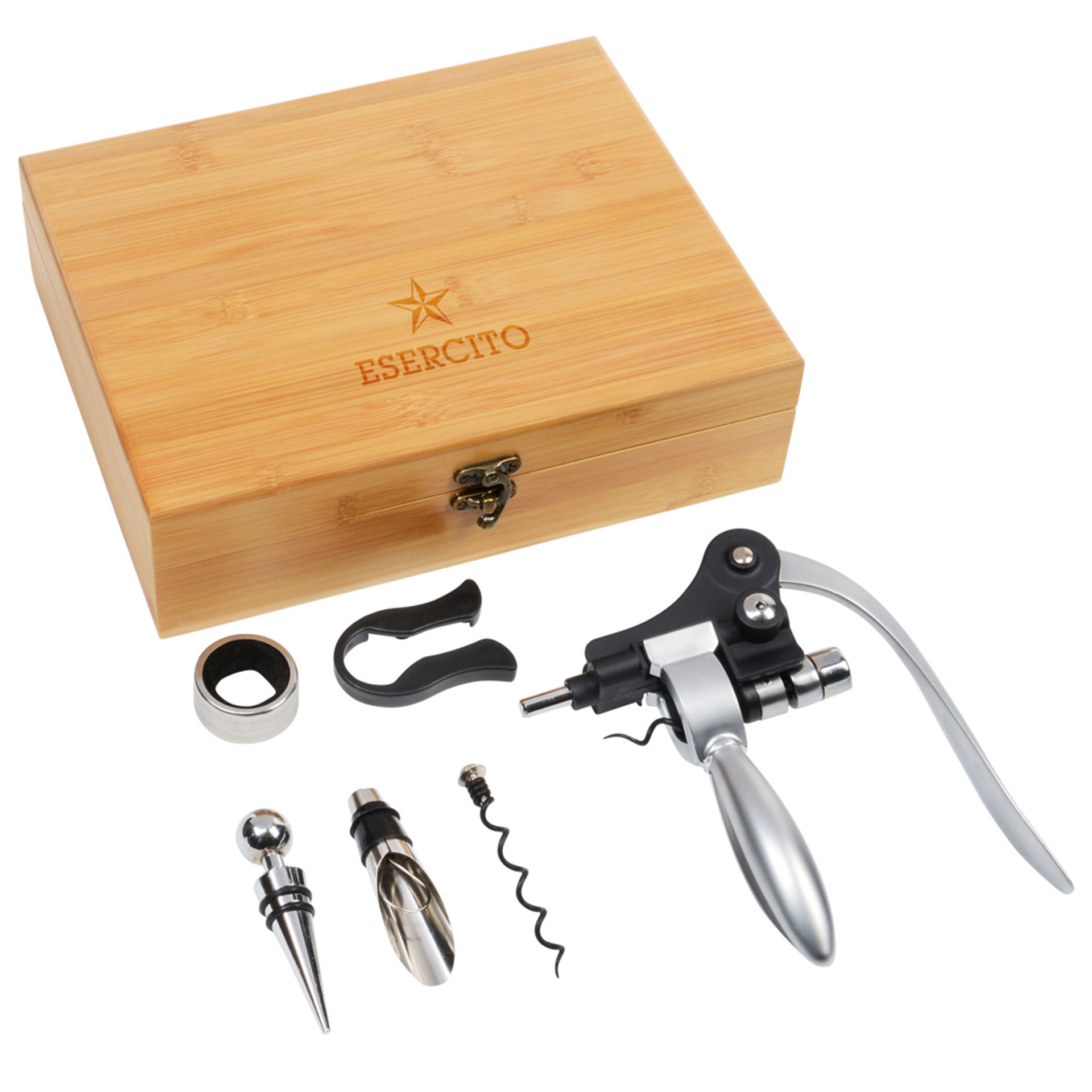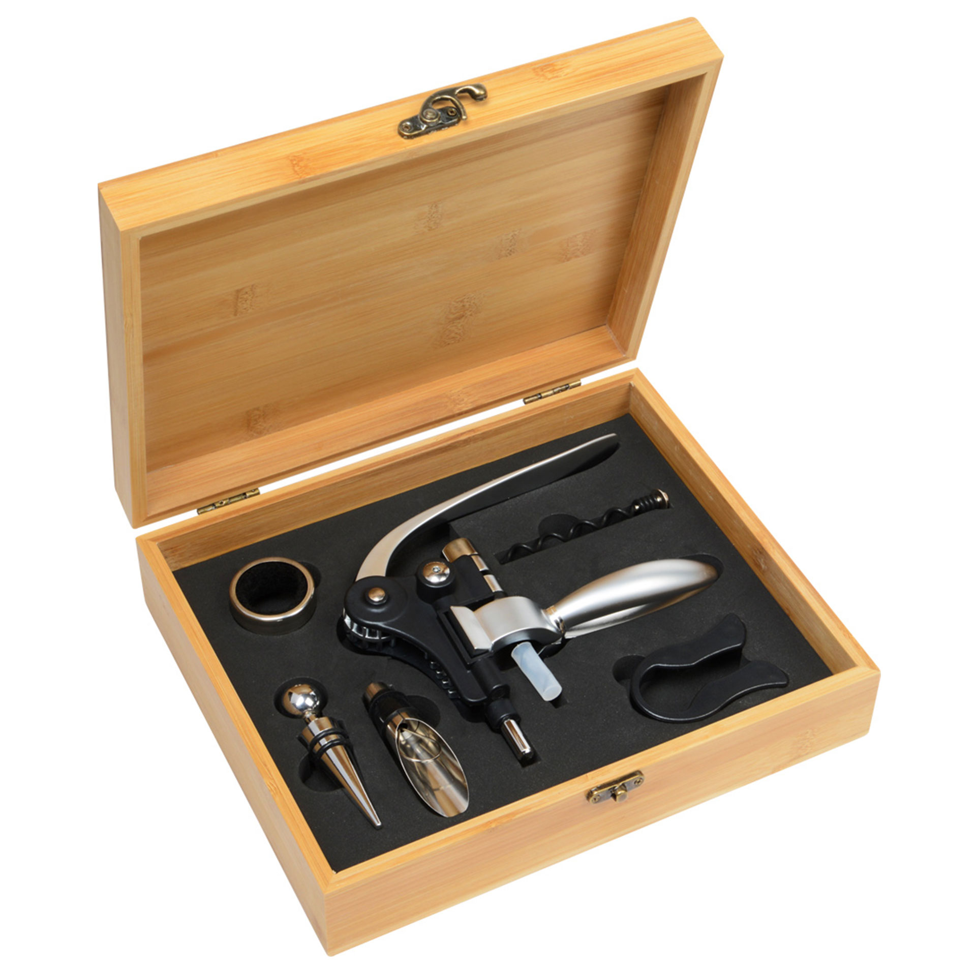 SET VINO DA SOMMELIER IN SCATOLA DI BAMBU' CON CAVATAPPI A LEVA, FUSO DI RICAMBIO IN ACCIAIO AL CARBONIO, TAPPO BOTTIGLIA IN METALLO, ANELLO SALVAGOCCIA IN ACCIAIO INOX, VERSATORE IN METALLO E TAGLIERINA DIMENSIONE 27 X 21,5 X 7,5 CM