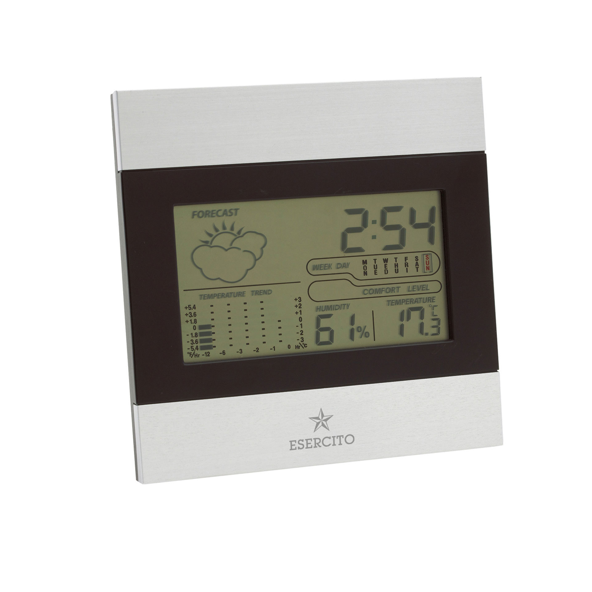 STAZIONE METEO SHINY DAY, DISPLAY LCD, FRONTALINO IN ALLUMINIO, FUNZIONE ALLARME, INDICAZIONE DEL GIORNO, TERMOMETRO, PIEDINO DA APPOGGIO SUL RETRO DIMENSIONE 13 X 2 X 13 CM