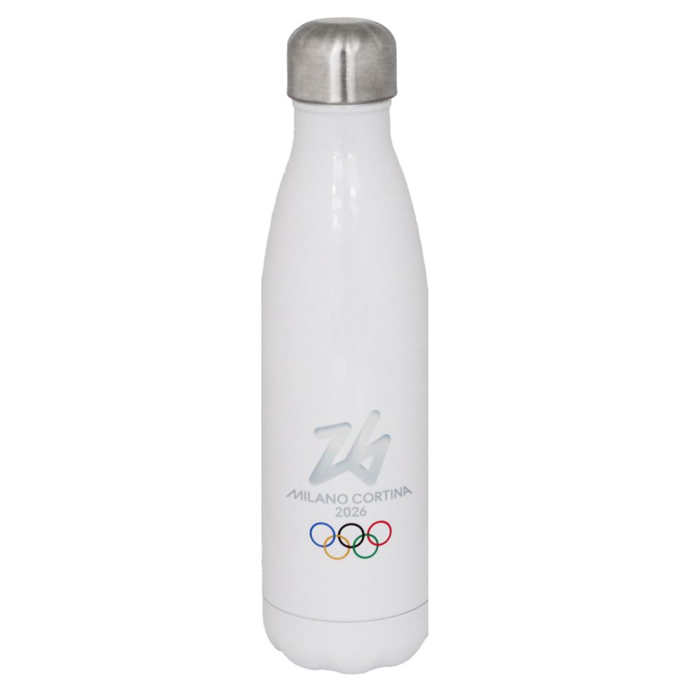 BORRACCIA OLIMPIADI MILANO CORTINA 2026 BIANCA TERMICA IN ACCIAIO 500 ML ALTEZZA 26 CM TAPPO ARGENTO LOGO OLYMPIC MASCOT TINA COLORATO 5 CERCHI SU FONDO BIANCO STAMPA 360?