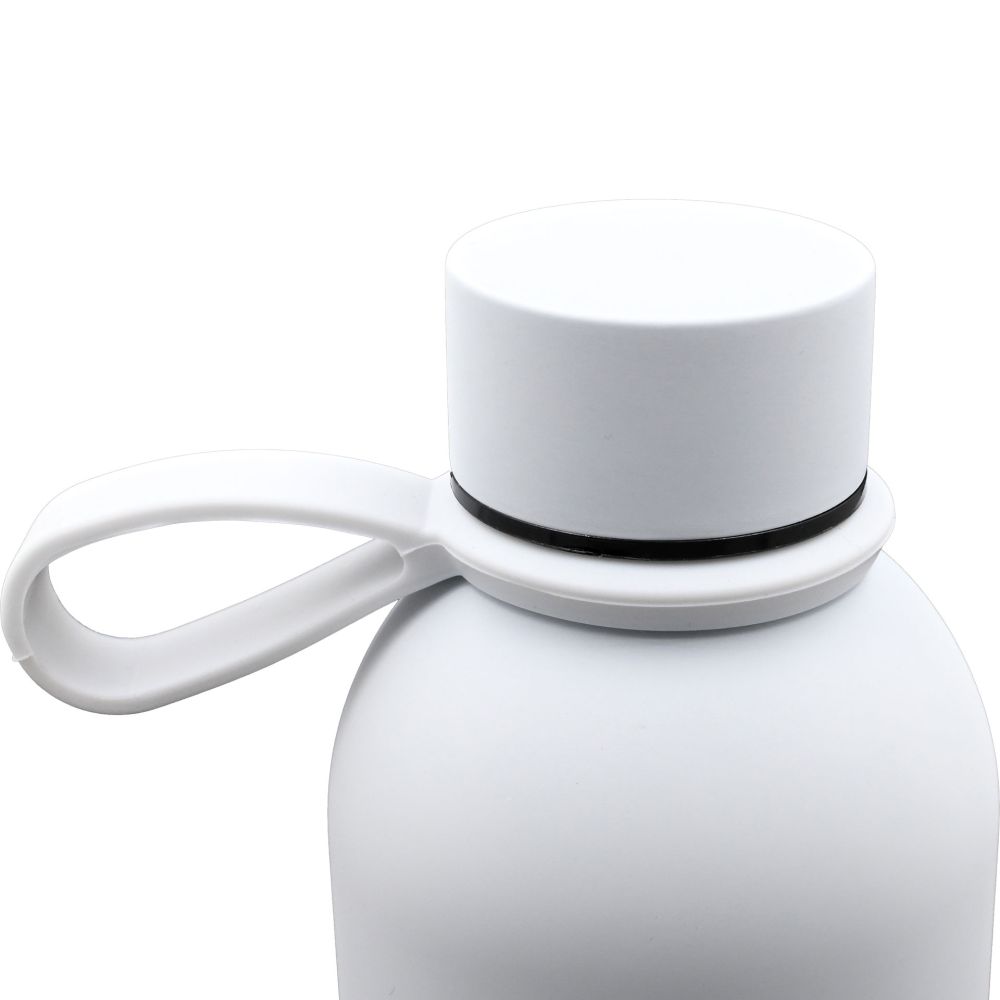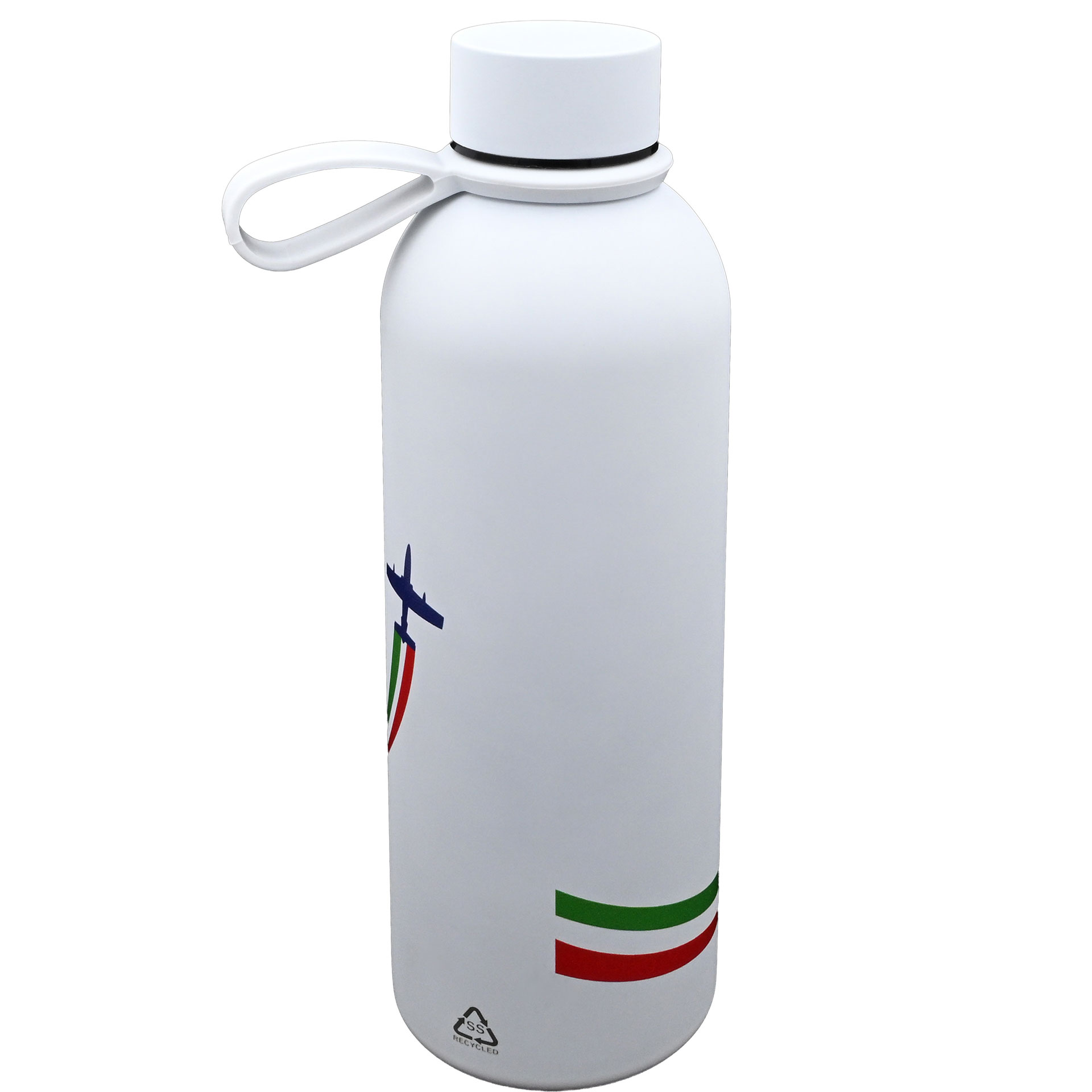 BORRACCIA BIANCA IN ACCIAIO INOX 304 RICICLATO, DOPPIA PARETE, FINITURA GOMMATA, MANTIENE 8 ORE IL CALORE E 12 ORE IL FREDDO DIMENSIONE 7,5 X 23,0 CM CAPACITA' 500 ML LOGO F.T. E CUORE TRICOLORE
