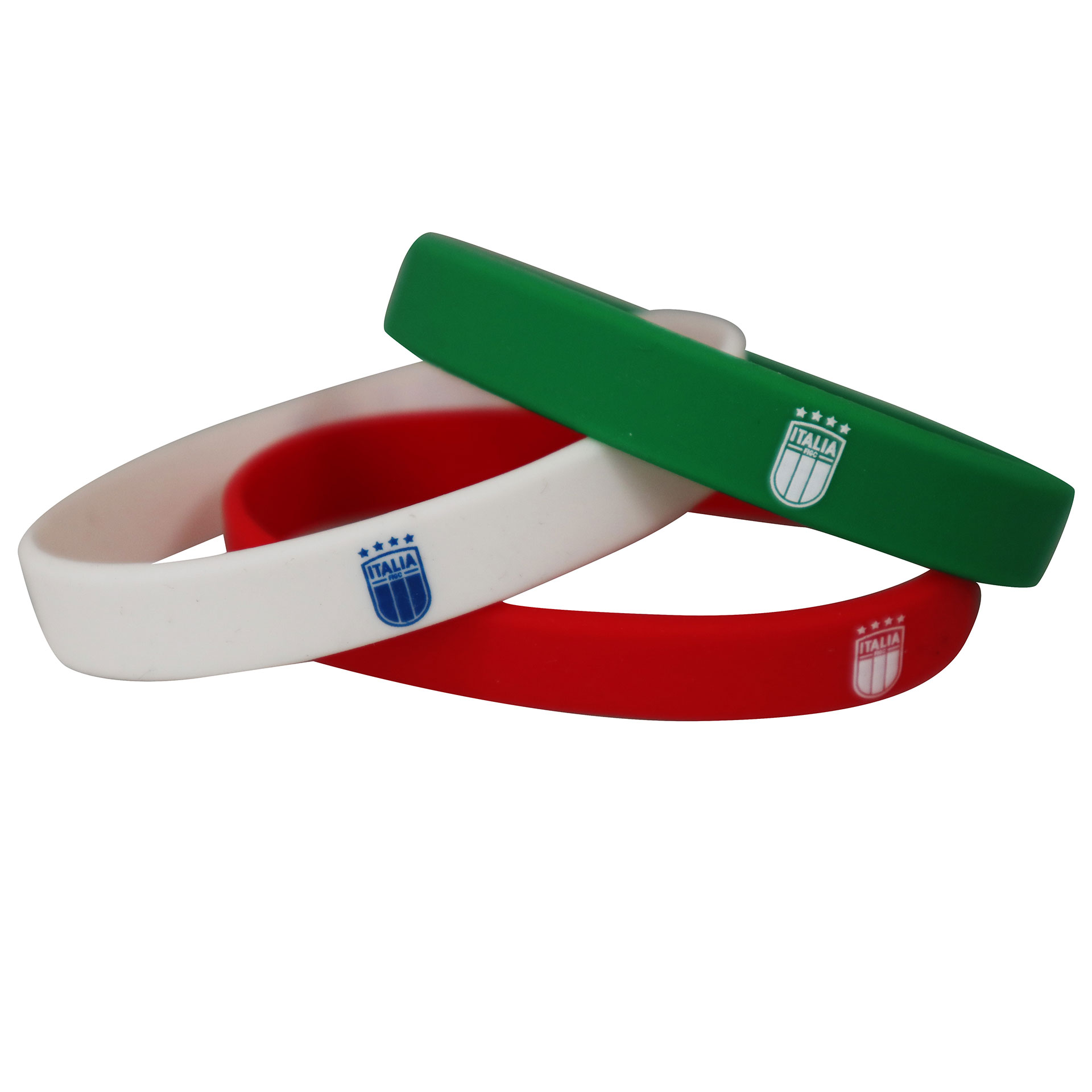Kit di tre braccialetti in silicone: - Verde con scritta e logo ufficiale Nazionale Italiana FIGC in bianco - Bianco con scritta e logo Italia in azzurro - Rosso con scritta e logo Italia in bianco MISURA: Adulto MATERIALE: Silicone