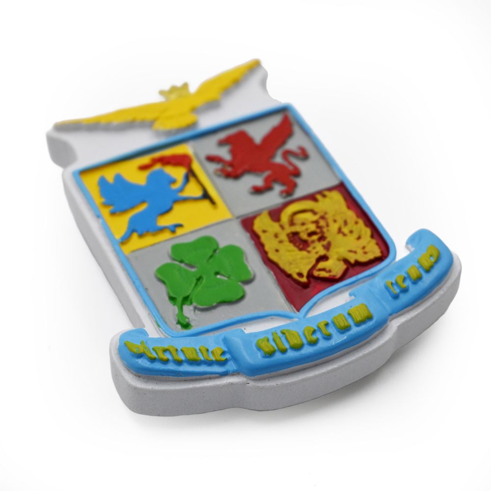 Magnete decorativo sagomato a forma di scudo araldico, in resina rigida dipinta a mano.