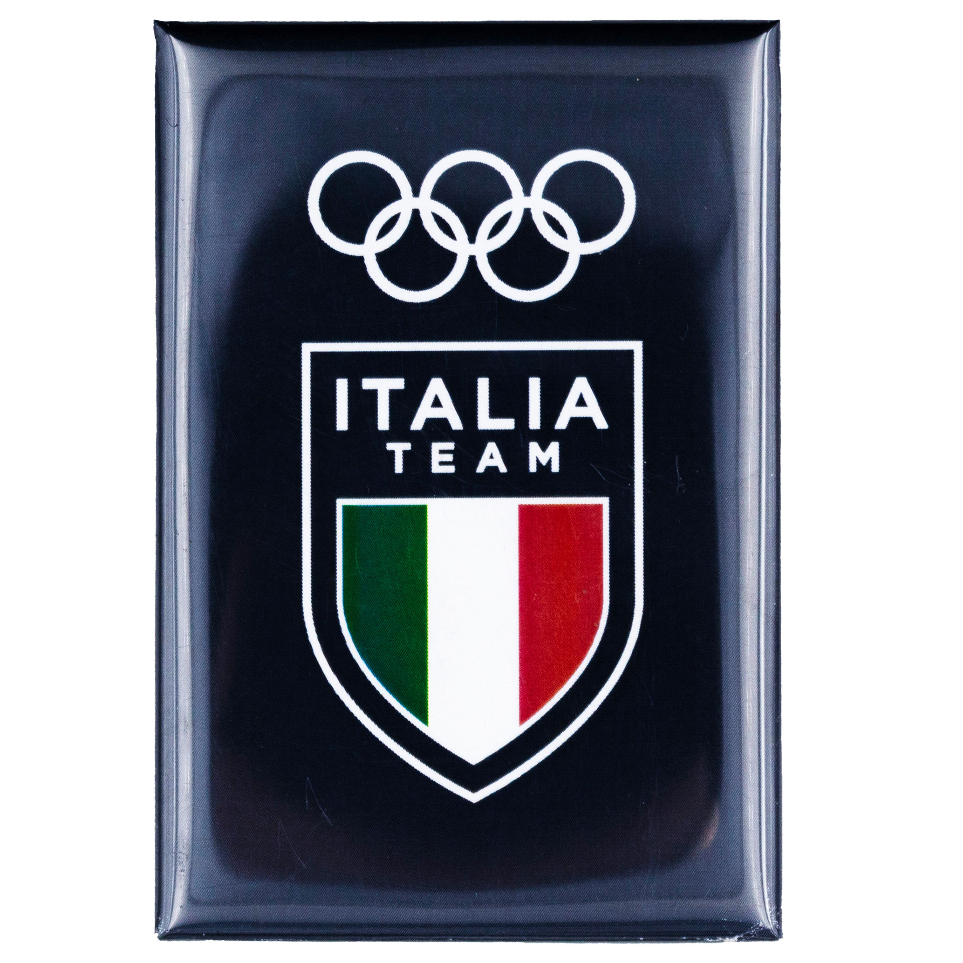MAGNETE ITALIATEAM IN METALLO STAMPATO RETTANGOLARE DIMENSIONI 78X53 MM LOGO OLYMPIC EMBLEMA CERCHI BIANCO E SCUDO ITALIA TEAM BIANCO+TRICOLORE SU FONDO BLU