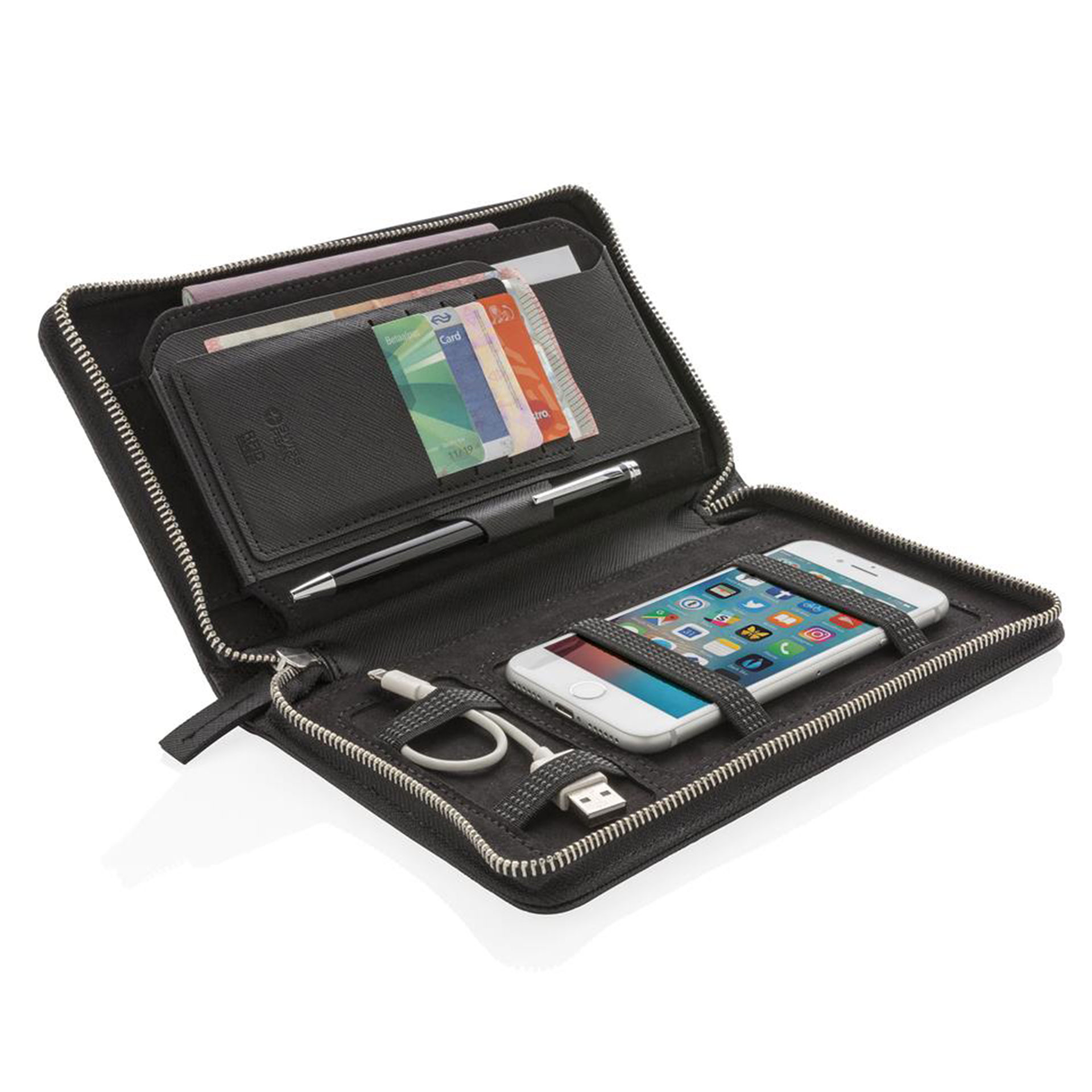 PORTA CARTE DI CREDITO LUSSUOSO CON PROTEZIONE RFID PER MANTENERE AL SICURO TUTTI I DATI CONTENUTI NELLE TUE CARTE INCLUDE 4 TASCHINI PORTA CARTE E UN ANELLO PORTA PENNA NELLA PARTE DESTRA SPAZIO PER INSERIRE SMARTPHONE DIMENSIONE 22,7 X 13,9 X 2 CM
