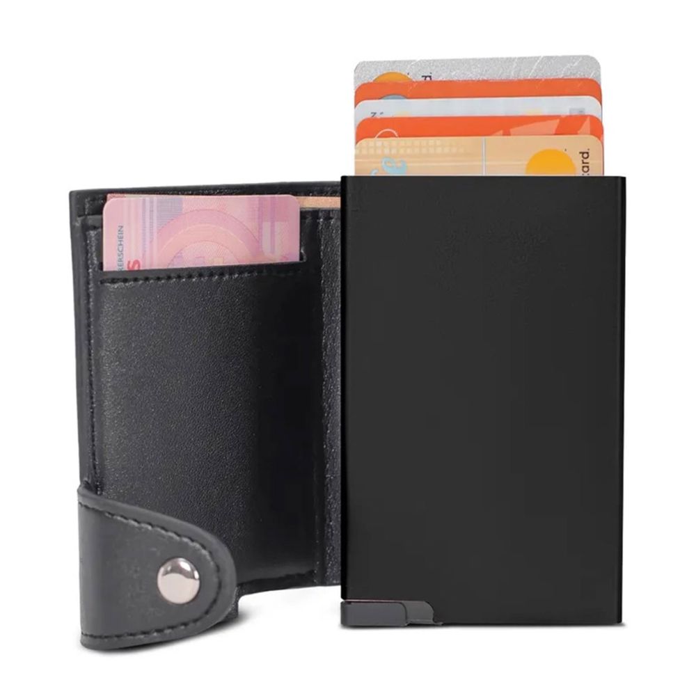 PORTACARTE IN ALLUMINIO CON ELEGANTE PORTAFOGLIO IN SIMILPELLE CON PROTEZIONE RFID PER MANTENERE AL SICURO TUTTI I DATI CONTENUTI NELLE TUE CARTE IL PORTAFOGLIO PUO' CONTENERE SEI CARTE DI CREDITO E BANCONOTE DIMENSIONE 7,2 X 9,8 X 2,2 CM