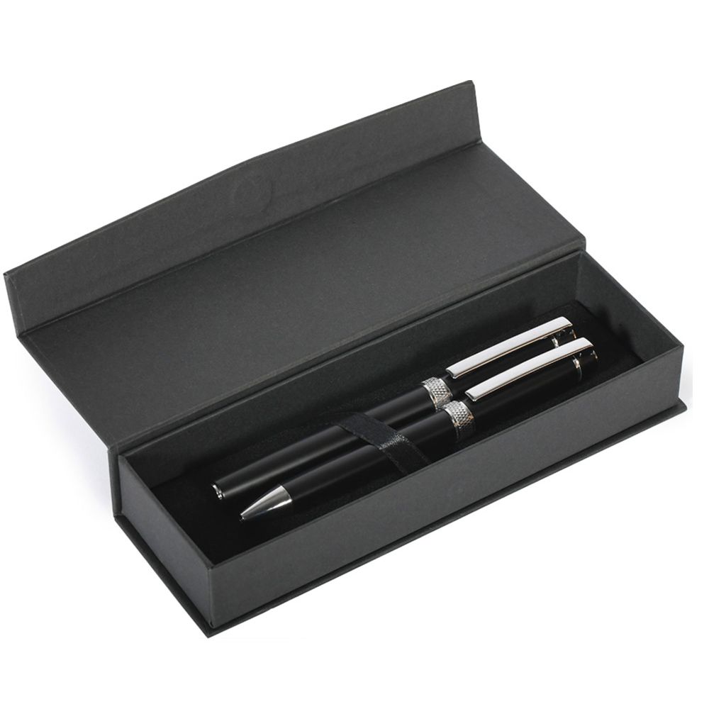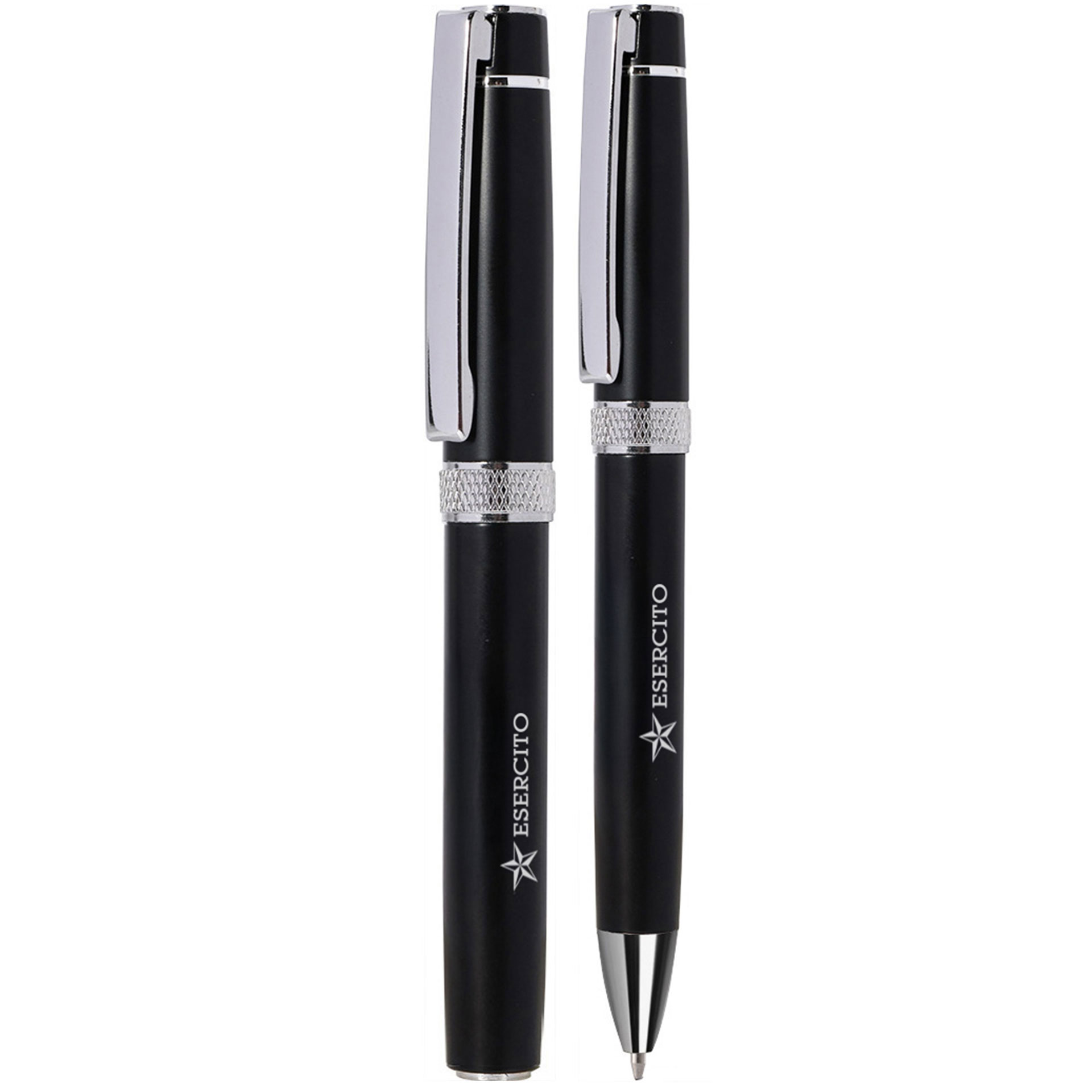 SET SCRITTURA COMPOSTO DA, PENNA A SFERA CON CHIUSURA A ROTAZIONE E PENNA ROLLER CON CHIUSURA A CAPPUCCIO ENTRAMBE IN ALLUMINIO RICICLATO, CON CLIP IN METALLO E REFILL NERO