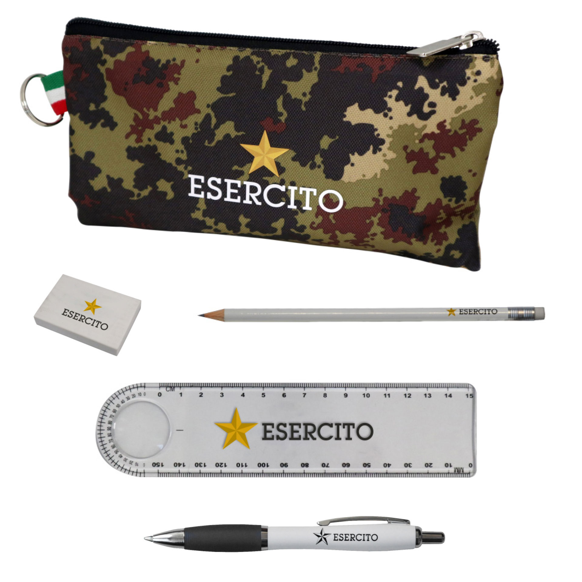 SET SCRITTURA LOGO ESERCITO COMPOSTO DA 1 RIGHELLO, 1 GOMMA, 1 MATITA, 1 PENNA, 1 PORTAPENNE