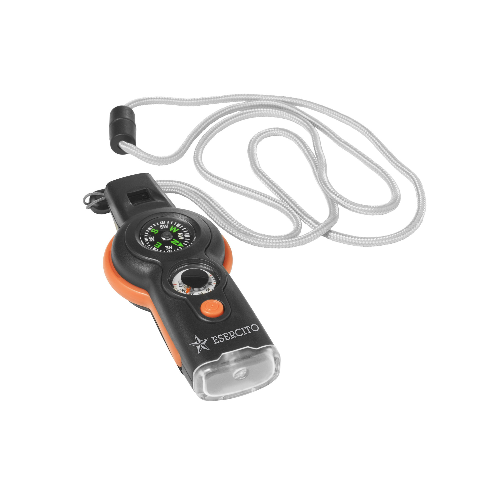 STRUMENTO D'AVVENTURA MULTIFUNZIONE, FISCHIETTO, BUSSOLA, TERMOMETRO GRADI CELSIUS E FAHRENHEIT, LUCE, SPECCHIO, LENTE, CORDONCINO CON SGANCIO DI SICUREZZA E DISPOSITIVO ANTISOFFOCAMENTO, DIMENSIONI 10,8X4,6X2,3 CM