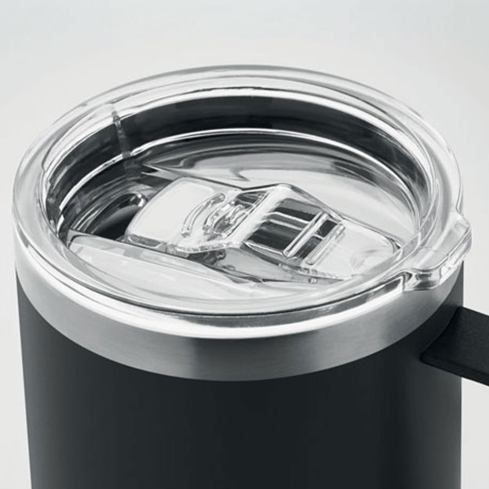 TAZZA A DOPPIO STRATO IN ACCIAIO INOX RICICLATO NOVANTA PER CENTO ACCIAIO INOX RICICLATO E DIECI PER CENTO ACCIAIO INOX CON COPERCHIO SCORREVOLE DIMENSIONE 11,5 X 11,3 CM CAPACITA' 300 ML